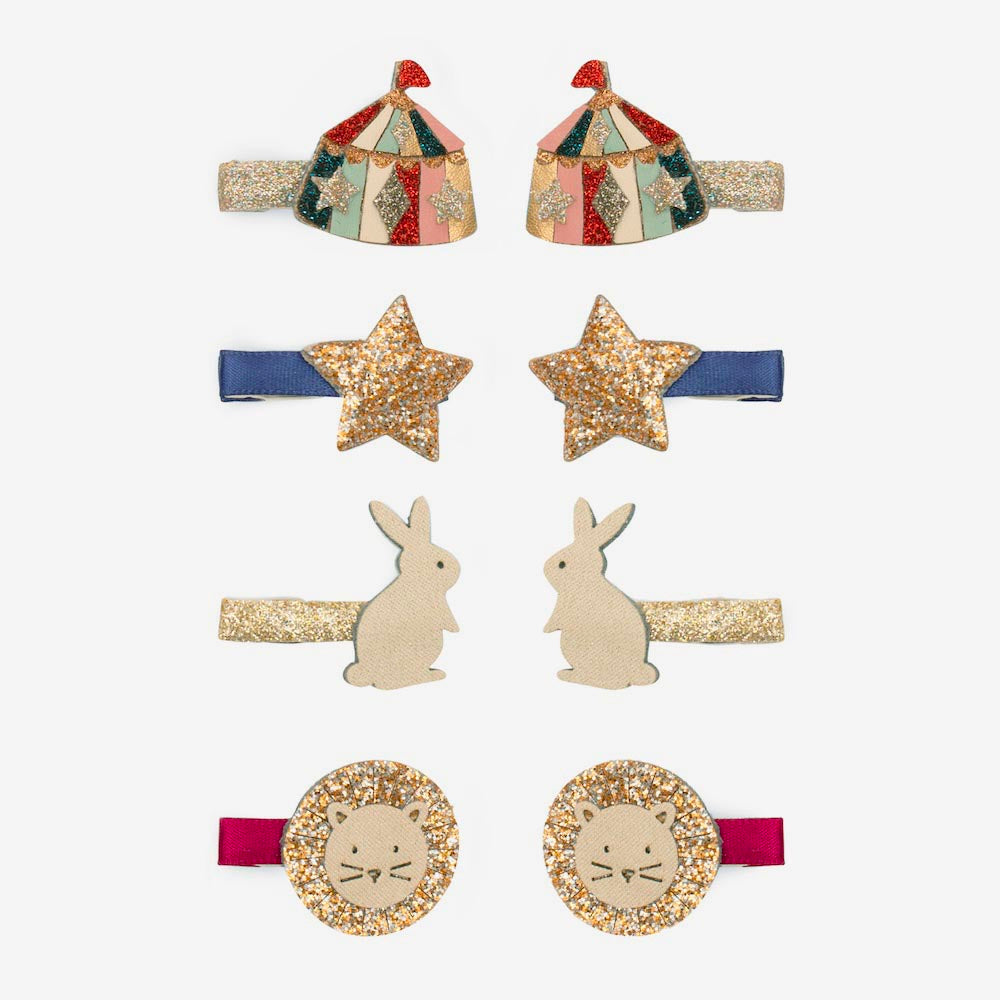 Roulement de tambour ! Installez-vous confortablement, le spectacle va commencer ! Ajoutez une touche de magie à vos cheveux avec ces adorables barrettes cirque ! Parfaits comme petit cadeau invité ou pour garnir une pochette surprise lors d'un anniversaire cirque.