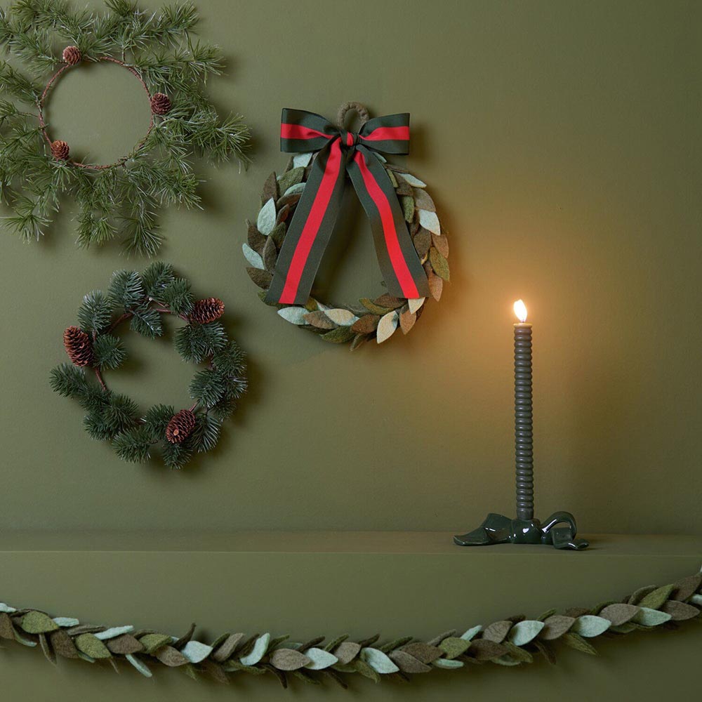 Cette couronne de feuilles en feutrine verte est parfaite pour compléter une décoration de Noël ! Vous pourrez l'accrocher sur votre porte d'entrée, à votre sapin, ou encore au dessus d'une cheminée.