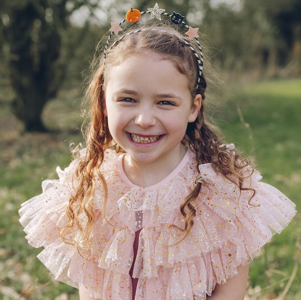 ComplĂ©tez le dĂ©guisement d'Halloween de votre enfant ou du votre avec ce serre-tĂȘte surmontĂ© de citrouille, chat noir et Ă©toiles. C'est l'accessoire indispensable pour le soir d'Halloween !