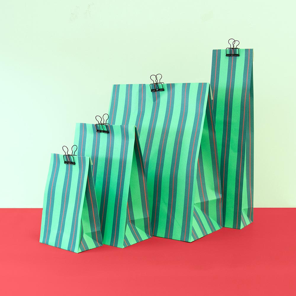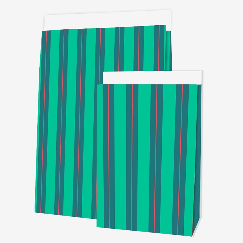 Cette pochette papier à fond plat imprimée de rayures vertes et rouges est idéale à l'occasion d'un anniversaire enfant ou pour apporter une touche festive à votre calendrier.