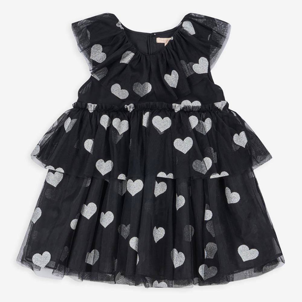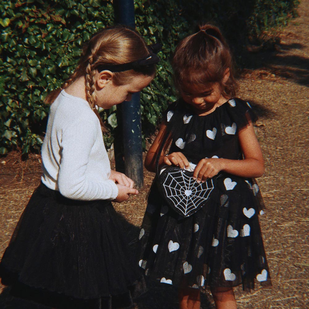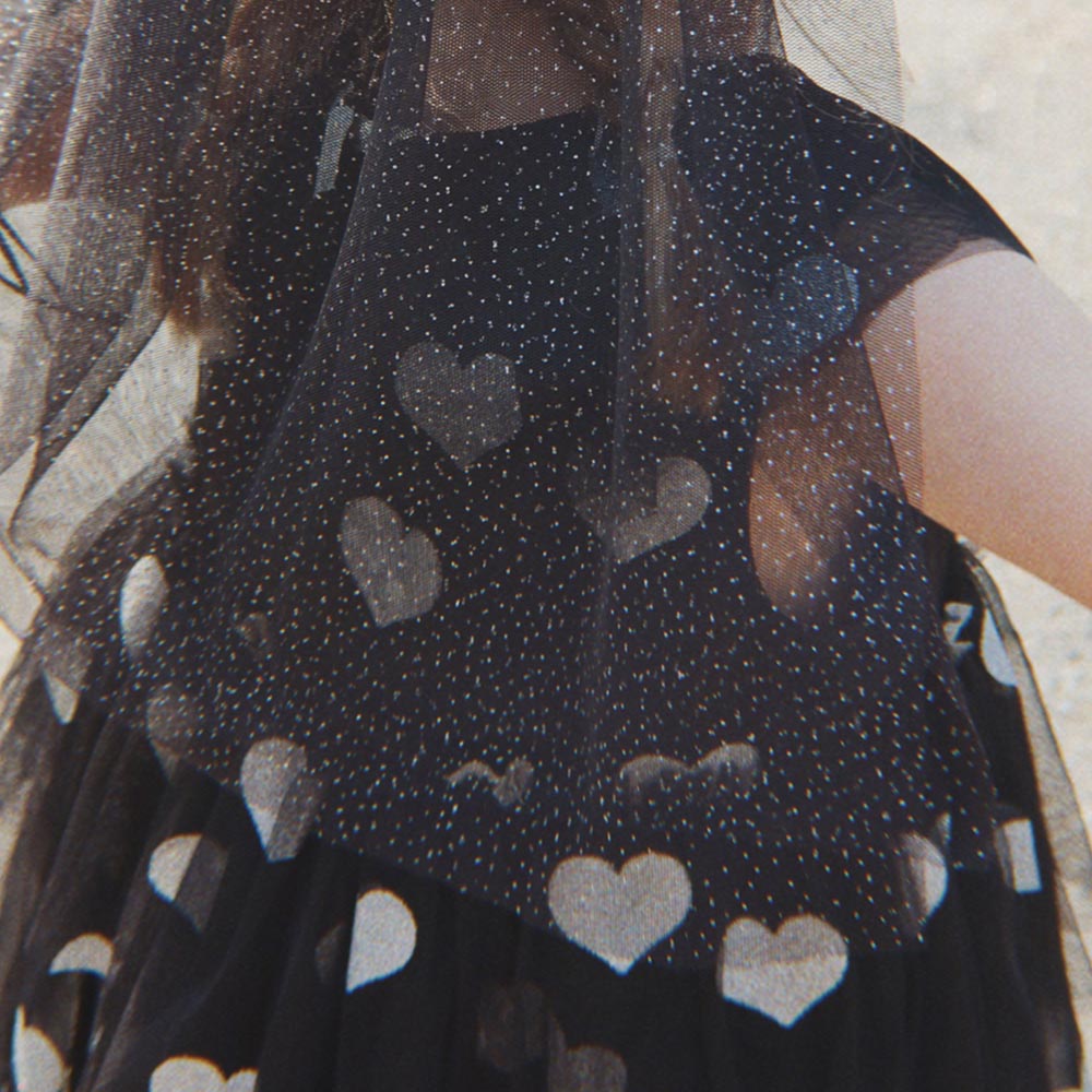 L'élégance mystérieuse s'invite à la fête avec cette robe noire de sorcière. Elle arbore de charmantes manches courtes et bouffantes, une jupe évasée, et est entièrement décorée de cœurs argentés pailletés pour un effet spectaculaire. Le déguisement idéal pour une petite magicienne !