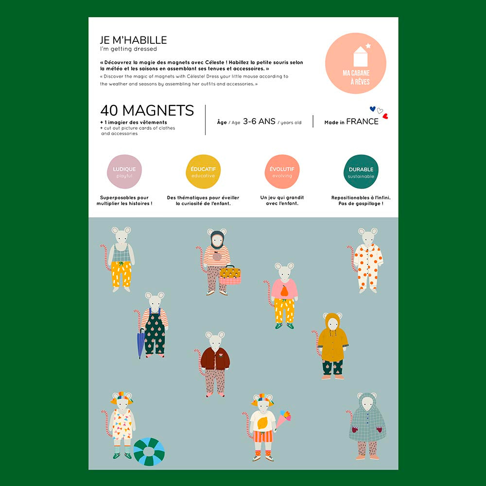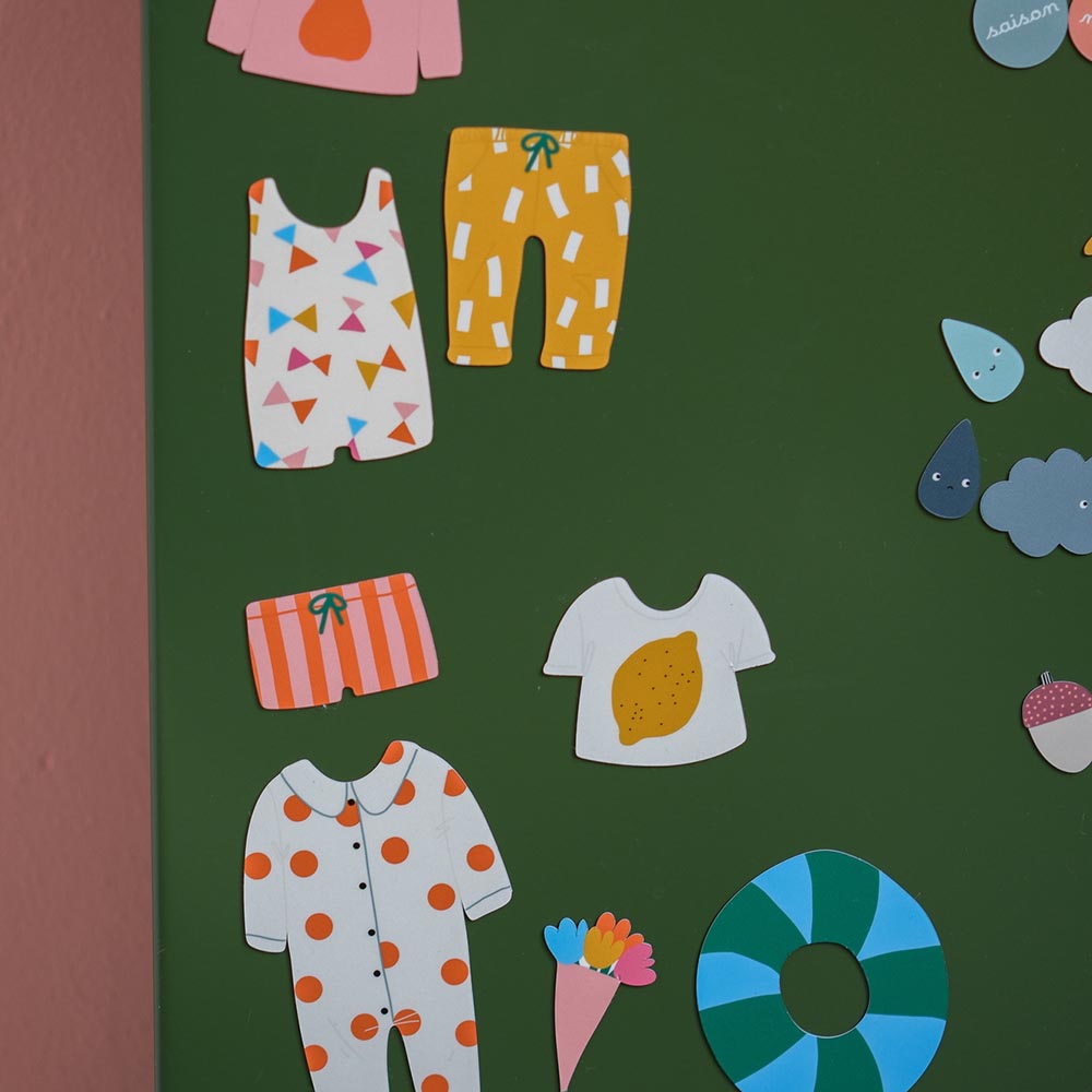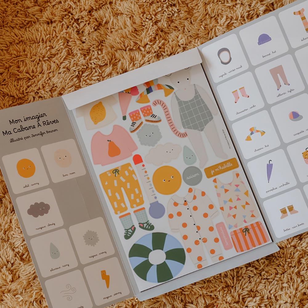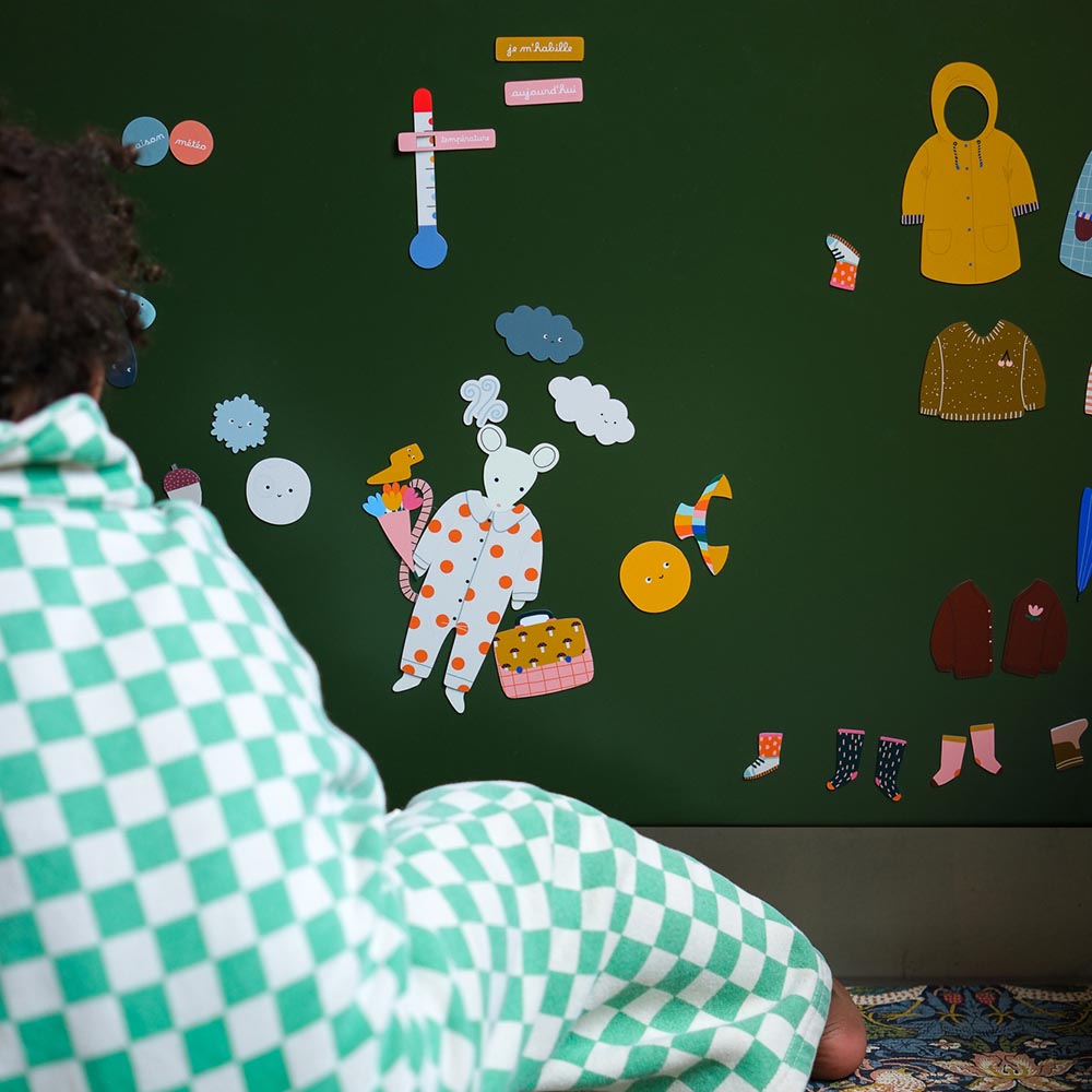 Apportez un peu de magie avec ce jeu magnétique "Je m'habille" imaginé par Ma cabane à Rêves. Habillez la petite souris selon la météo et les saisons en assemblant ses tenues et accessoires. Une petite souris qu’on habille, qu’on prépare pour la pluie, puis qu’on borde tendrement pour la nuit… Un jeu simple en apparence, mais qui aide à comprendre la notion du temps, à intégrer les rituels du quotidien, et à développer l’autonomie – tout cela dans le plaisir et la spontanéité. Le frigo se transforme en projection à rêves, pleine de couleurs et de souris.