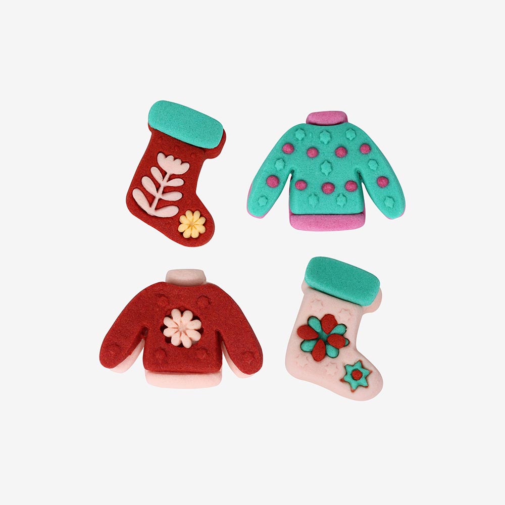 Ajoutez une touche colorée et élégante à vos biscuits de Noël ou à votre bûche de Noël avec ces adorables decorations comestibles pulls et chaussettes de noël. Parfaites comme deco biscuits de noel ou pour agrémenter votre deco buche de noel, ces décors en sucre apportent une note gourmande et amusante à vos créations. Idéales pour les fêtes, ces accessoires de cuisine sont un incontournable pour réussir vos desserts de noel et pour rendre le réveillon de noel encore plus inoubliable.