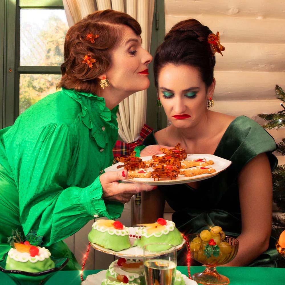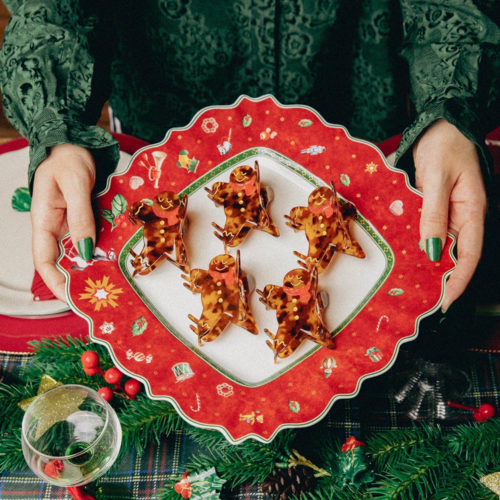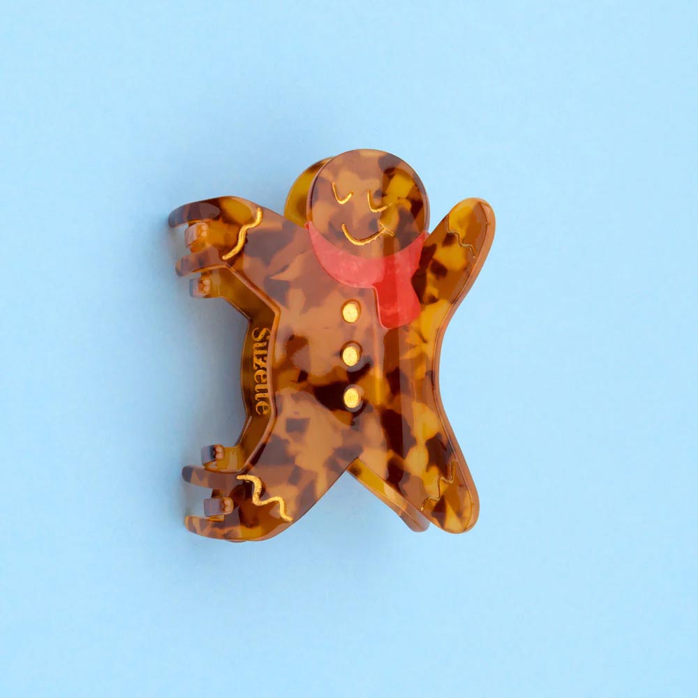 Laissez la magie des fêtes envelopper votre chevelure avec cette grande pince Gingerman Coucou Suzette, l'accessoire parfait pour un look de Noël délicieusement fun. Ce bonhomme Pain d'Épices au format pince est idéal pour maintenir généreusement les cheveux longs et épais, tout en y ajoutant une touche gourmande et régressive. Adoptez cet emblème des fêtes pour un style festif et plein d'humour !